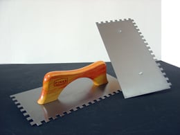 g) Cuando haya secado (unas 72 horas mínimo), prepara cemento cola (también se vende premezclado) y pega con él las nuevas baldosas. El cemento cola se aplica con una llana (ver foto), haciendo surcos para que al apoyar la nueva baldosa puedas regular, con más o menos presión, la situación idónea respecto a las que ya hay colocadas (ver segunda foto).
