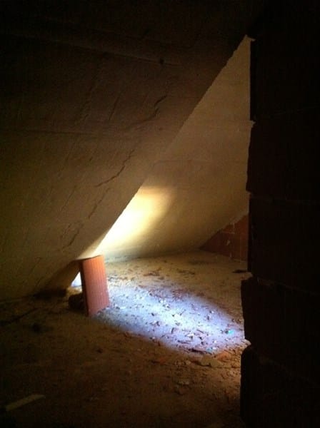 Las paredes verticales separan las casas colindantes y hay una cámara de aire que divide las viviendas, y el techo inclinado tiene una capa de aislante proyectado sin que se observen vigas metálicas.