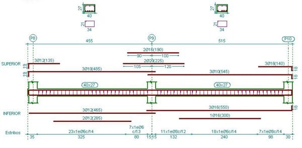 Por ejemplo, yo veo que la parte superior del P8 al P9 lleva 3 varillas del 10 de 485 cm, 3 varillas del 12 de 135 cm. Y en la inferior 3 varillad del 12 de 465 cm, 2 varillas del 12 de 285 cm. Y los estribos que serían 23 del 6 cada 14 cm.? Esto no se como se interpreta.