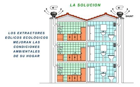 A ver, el aire caliente, que es el que va cargado de olores y humedad, se expande, por tanto pesa menos que el aire frio, el aire caliente sube. Y el aire frio baja, por eso los shunt de ventilación funcionan sin sistemas de extracción forzada.