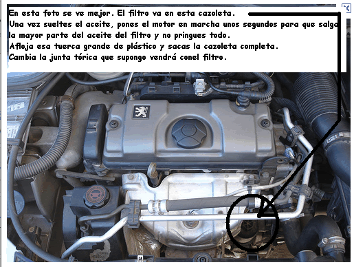 Voy a hacerle el cambio de aceite a mi coche, un peugeot 206 1.4 75 cv gasolina del año 2000, la foto del motor de mi coche es esta http://img146.imageshack.us/img146/1363/img53151800.jpg, no exactamente del mío porqué no tengo cámara de fotos, pero es casi igual que el mio. Simplemente el mio no lleva esa chapa metálica más clara, delante del bloque del motor.