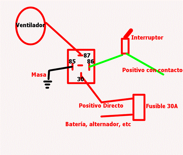 El (+) directamente de la batería y este al interruptor y otro al ventilador que va al interruptor, sin poner interruptor, osea directamente también calienta.