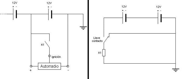 He tirado un cable desde el punto medio de las baterías (lleva 2 de 12V en serie), para así poder usar el cable de ignición (si hago la instalación con transformador tendría que poner 2, uno para el constante y otro para el de ignición, o al menos así lo entiendo yo). Doy al contacto y todo va perfecto (bueno, no he conectado nada aún, lo compruebo con el tester), pero al quitar el contacto, en lugar de abrir el circuito, se invierte la polaridad del cable de ignición.