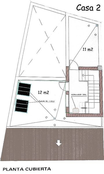 La idea era poner las placas sobre el tejado grandote que se ve en el plano, aunque creo que no tiene buena orientación, donde irían estupendamente es en el tejado de terminar las escaleras, que es la zona más elevada de toda la casa, es más, no hay cerca ninguna otra edificación. Es un tejado a 4 aguas, (creo que se dice así). Volvemos a lo del desconocimiento sobre estos temas pero creo que es un sitio magnifico para poner las placas y así no estropear ese pedazo de azotea, pero no hay forma de convencerlos.