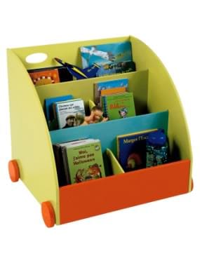 Es un estante expositor de cuentos, muy común en bibliotecas infantiles y ludotecas. Por lo que puedo observar los paneles divisorios son más delgados que los frontales y costados y aunque no puedo observar el fondo creo que son de madera contrachapada de 12mm los laterales y delantero (puede que también el trasero) y de algo menos, 8 los centrales y divisorios perpendiculares. Pienso que es contrachapado, porque es más ligero y como se puede observar tiene dos agujeros agarraderas para trasladarlo de un lugar a otro. Creo que los paneles divisorios van encajados en ranuras ciegas hechas en los laterales (con fresadora) y encoladas sin tornillos. El frontal, el trasero y posiblemente el fondo vayan sujetos encolados y con clavijas de madera, ya que no se aprecian tornillos por el exterior. Los divisores perpendiculares, creo que van encajados por una ranura central a los paneles divisorios y sin tornillos ni cola. Es un bonito diseño Si lo que te gusta es el diseño y quieres utilizar otro tipo de sujeción más sencilla y cómoda de hacer, incluso otro tipo de madera, ádmelo saber, aunque no creo que quede tan fino y bonito el diseño ya que habría que cambiar grosores y se podrían notar tornillos. Aunque hay forma de disimularlos. Y por supuesto pesaría más.