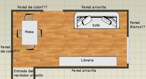 Queríamos pintar dos paredes que están pegadas en amarillo, en la zona del sofá y de la librería (ésta de color abedul). En la zona con la mesa de comedor pensábamos dejar las paredes blancas, pero ahora pensamos que podría quedar bien pintarlas también de color.