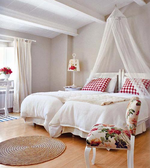 A mi las camas de hierro forjado, me gustan mucho, y me parecen ya de por si muy románticas, si las combinas con ropa de cama blanca y muchos cojines, tienes tu objetivo. También le da ese aire colocar como un dosel -mosquitera colgando del techo, encima de las almohadas más o menos, es como tener cama con dosel, y si de esa mosquitera cuelgas lazos de colores o adornos como flores o mariposos parecerá de cuento... Un dosel-mosquitera como este lo encuentras en Ikea, y creo que ya los tienen hasta de colores, sino, siempre lo puedes teñir...