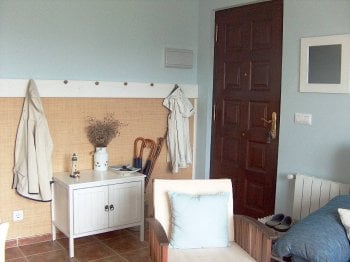 Tenemos que pintar un apartamento en la playa (solo 1 habitación, de 10 m2), esta situado en esquina, las puertas son de haya vaporizada y el suelo amarillo más bien claro (con una pizca de naranja), tiene un salón-cocina de unos 22 m2, sin separación entre ellos, en la cocina los azulejos son amarillo anaranjado abajo y blanco arriba, armarios de cocina blanco y un poco naranja, el salón tiene dos ventanales de unos 3m cada uno formando la esquina y a modo de balcón ( para aprovechar el espacio) y otra ventana grande al termino de cada uno de ellos, por lo que dos paredes son prácticamente ventanales, pero hay algo de pared también. Casi en la esquina hay un poste de la obra, donde tiene intención de colocar colgada la televisión, ya que no tiene otro lugar.