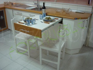 Está claro que la distribución tiene que ser lineal, todos los muebles a un lado de la pared, y al otro lado un mesa (estrecha porque sino no queda espacio para abrir los cajones). Esto es lo que nosotros hemos pensado pero nadie nos ha dicho que esto sea lo idóneo para nuestra cocina.