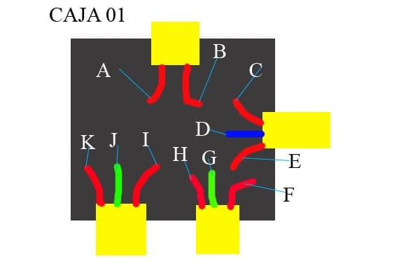 El mayor lío, obviamente lo tengo en la caja 01. De los cuatro tubos ( recuadros amarillos ) el que va hacia la derecha, está claro que es cableado del enchufe de la caja 02 que toma la alimentación del empalme que había en la caja 01; el tubo amarillo que sube hacia arriba con los cables A y B, es el que va a alimentar la luz del techo... Lo que no tengo tan claro, son los dos tubos inferiores ...