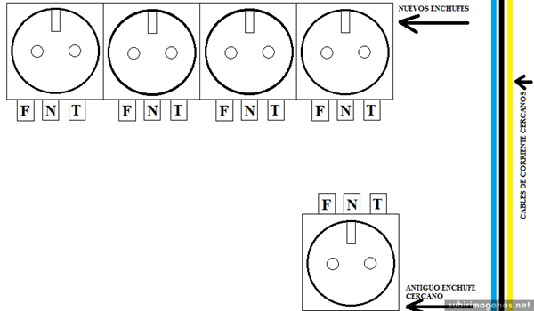 ¿Podría alguien ayudarme con esta instalación? Quiero ampliar los enchufes de la cocina y he preparado el hueco para 4 enchufes. Cerca pasa un tubo negro con la corriente eléctrica tal y como he dibujado con sus 3 cables. Se trata de hacer llegar corriente a los 4 enchufes para poder enchufar varias cosas simultáneamente (¿en paralelo?). El antiguo enchufe está cerca por lo que también podría sacar la corriente de ahí y eliminarlo. Cualquier indicación sobre el tipo y tamaño de cable será de utilidad. El dibujo está hecho con paint.