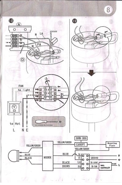 El problema es que viene con un interruptor conjunto para la luz y con un regulador de velocidad para el ventilador, en mi interruptor y en el punto de luz solamente tengo dos cables, y en la lámpara tengo cuatro cables (uno de ellos es el de tierra) y en el interruptor nuevo tengo tres entradas en las que pone to light, fan y to hot y no se como conectarlo, he hecho un puente en la lámpara y al accionar el interruptor funciona a la vez la luz y el ventilador y no funciona el regulador de velocidad del interruptor. ¿Cómo puedo conectarlo para que funcione el interruptor con el regulador de velocidad.?