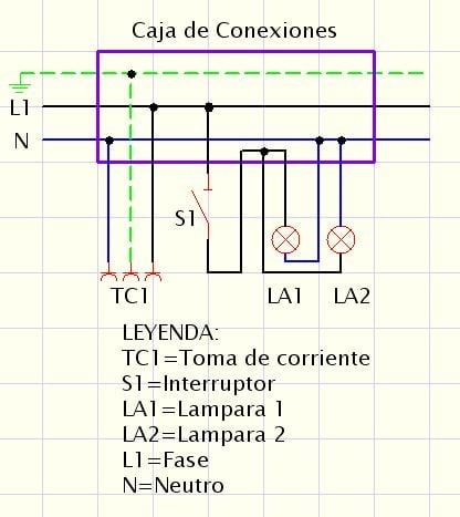 La manera de conectar es sencilla. En la base doble el neutro (azul) deberás conectarlo en uno de los bornes del enchufe, y a su vez llevarlo a cada una de las lamparas. La fase deberás llevarla al otro borne del enchufe y realizar un puente con un trozo de cable de ese borne a uno de los 2 que trae la base para el interruptor.