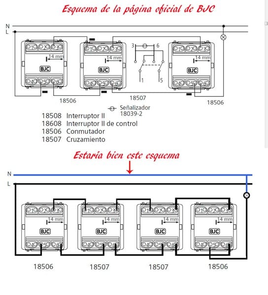 Tengo una habitación con tres interruptores para el encendido de la lámpara y al hacer obras, necesito poner un cuarto interruptor para dicha lámpara; en la página del fabricante de los mecanismos aparece un esquema con tres, dos conmutadores y uno de cruzamiento pero según tengo entendido los de cruzamiento llevan cuatro tornillos para colocar los cables y este trae seis. He realizado un esquema como creo yo que iría pero no sé si es el acertado y no quisiera meter la pata.
