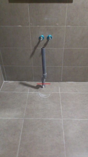 - Tal como veis en la foto, el tubo de 40 mm sale por la losa, y va unido a dos codos de 45º cada uno, y después a un tubo flexible que terminaba conectado a la válvula de desagüe del lavabo (no llevaba sifón este lavabo).