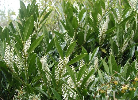 Prunus laurocerasus "Otto Luiken"; Arbusto muy compacto, perenn. Posee hojas de disposición vertical, estrechas, lisas y de color verde oscuro, con producción de espigas de flores blancas en primavera, seguidas de la producción de frutos parecidos a cerezas, primero rojos y despues negros. Resistente, altura 1,5m.