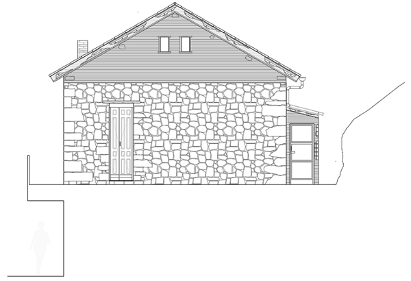 La vivienda tiene una única planta, y en la parte superior un desván. Se sitúa en una ladera, por lo que la parte frontal de la casa (a la izquierda en la imagen), tiene un corredor que da acceso a una segunda y principal puerta de la vivienda. Los muros son de piedra natural, que he comparado con un catálogo, y lo más razonable es que sea de Arenisca. Estos tienen un grosor mínimo de 40 cm (la fachada dibujada). Quisiera saber como puedo calcular o hacer una estimación de la resistencia de estos muros, ya que queremos ampliarla dándole un poco más de altura al desván (que empieza en la linea que se percibe en el alzado), y sustituir la cubierta por una más ligera con estructura de madera y paneles termochip.