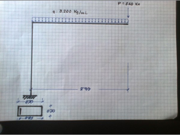 Supongamos que me dan un plano con los detalles de secciones, luz, armaduras, características de los materiales y cargas de la viga ménsula y pilar donde se empotra. Supongamos que el pilar no recibe otra carga que la que le transmite la viga. No hay empujes de tierras, no hay acciones de viento, no hay nada de nada más que lo expuesto. En una palabra, esto sería como una Linvertida (prescindo del cimiento, porque para lo que quiero saber, creo que no me hace falta). Supongamos que me piden comprobar que la viga (solo la viga) no vuelca. Lo haría de la siguiente manera:
