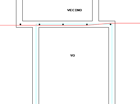 Lo que yo veo, es que como se aprecia en la imagen que incluyo, la malla de la valla "cae" en mi mitad. La malla es la línea roja, la línea divisora de las medianeras es la celeste, y los puntos negros son los mástiles. Por lo que yo no dispongo de "mi mitad", que al ser un muro de 25 cm de ancho, debería de ser de 12,5 cm, pero con la malla de la valla "en mi mitad", solo me quedan unos 8 cm, y el ladrillo es de 9 cm.