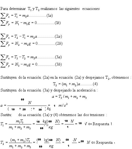 Si se conectan tres bloques sobre una mesa horizontal sin friccion y se les jala hacia la derecha con una fuerza de T3=60N. Si m1=10kg, m2=20kg y m3=30kg. Encontrar las tensiones T1 y T2.