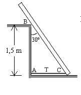 3.-1. Una barra homogénea de 1200 N de peso y de 2,0 m de longitud, descansa sobre un piso liso y sobre el borde liso B indicados en la figura. La barra esta atada a una cuerda AC que se encuentra cerca del piso. Determine: