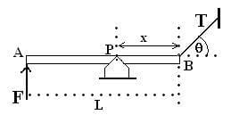1.-1. La figura muestra una viga AB de peso despreciable y longitud L = 5m, en equilibrio. Si F = 500 N, T = 200 N y ? = 30°. Halle: