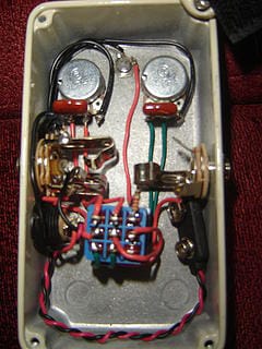 El pedal sirve para conectar la guitarra por el input, la señal pasa por dos potenciómetros en los que seleccionas un volumen distinto para cada uno, y cuando pisas el botón donde todo está conectado 3PDT va a través de un potenciómetro o el otro.
