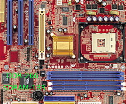 En la captura puedes ver donde se coloca cada módulo de memoria. Dos zócalos están dirigidos a SDRAM-133, y otros dos, a DDR-266 Mhz Matizar, que ambos tipos de memoria, no se pueden mezclar entre sí, por lo que tengo entendido. Es decir, o se usa DDR o se usa SDRAM (como es tu caso),