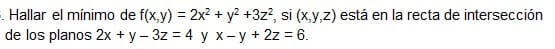 hola valeroasm. No se como hallar la recta de intersección de estos 2 planos para calcular el mínimo de la función me puedes ayudar?
