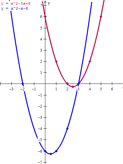 Ahora para los cortes con el eje X resolvemos la ecuación. También puede resolverse esta haciendo cuentas de que el producto de las raíces es 6 y su suma 5 y son 3 y 2 por tanto
