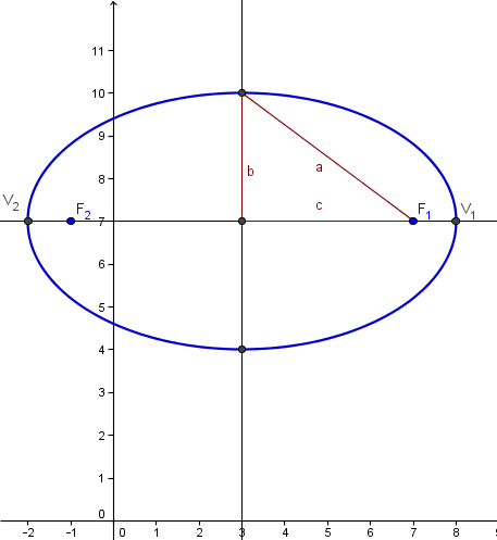 Además podemos calcular el centro de la elipse ya que está a distancia 5 de los vértices, por lo tanto en x es -2+5 = 3 y el centro es (3, 7)