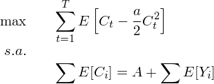 max sumatoria(E[Ct - (a/2)Ct^2],t=1 hasta T)), sujeto a