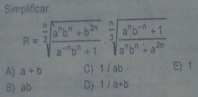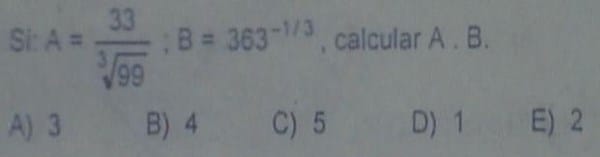 ¿Podrías decirme cómo has puesto las tres imágenes en la pregunta? ¿Alguna vez podrá venirme muy bien poder poner imágenes en alguna respuesta? Vamos con el ejercicio 2: Abreviare la raíz cúbica como rc. Ya sabes que 363^(-1/3) = 1/rc(363) luego AB=(33 / rc(99)) (1 / rc(363)) = 33 / (rc(99)rc(363)) = 33 / rc(99·363) En vez de usar una calculadora vamos a sacar factores mentalmente 99 = 3 · 33 363 = 11 · 33 99 · 363 = 3 · 33 · 11 · 33 = 33 · 33 · 33 = 33^3 Y finalmente: AB = 33 / rc(33^3) = 33 / 33 = 1 La respuesta es la D) 1 1) (a^n)(b^n) + b^(2n) (b^n) (a^n + b^n) (b^n) (a^n + b^n) ---------------------------- = ------------------------- = ------------------------- = a^(-n)(b^n) + 1 b^n b^n + a^n -------- + 1 --------------- a^n a^n . = (a^n)(b^n) De forma análoga se demuestra que lo que hay dentro del segundo radicando es 1 / [(a^n)(b^n)] También hay que tener en cuenta que la raíz n/2 es la exponencial 2/n R = [(a^n)(b^n)]^(2/n) · 1 / ([(a^n)(b^n)]^(3/n)) = Deja que en un solo paso haga que a^[n·(2/n)] = a^2 y similares que si no nos vamos a morir de paréntesis para no entender nada R = (a^2)(b^2) / [(a^3)(b^3)] = 1 / (ab) Luego la respuesta es la C) 1/(ab) Te dejo esto de momento. Ahora tengo cosas imprencindibles que hacer y ya haré el ejercicio que queda cuando pueda.