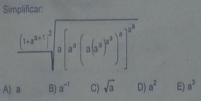 ¡Vaya por Dios! No sé que pulse y salí de aquí se borró todo. Cuando ya había terminado. Otra vez a escribirlo. Bueno usaremos estas dos fórmulas (a^b)^c = a^(bc) (a^b)(a^c) = a^(b+c) Dentro de la raíz cuadrada hay tenemos cuatro veces la base "a" vamos a calcular qué exponente queda en cada una de ellas. Lo haré de esta forma en lugar de arrastrar complicadas expresiones porque con este editor son muy pesadas e incomprensibles de tantos paréntesis que hay que poner para que no haya ambigüedades posibles. La primera a quedará solo con el exponente 1 La segunda tiene un exponente a que luego se elevará a (a^a). El exponente será el producto a(a^a) = a^(a+1) Las tercera tiene exponente 1 que luego se eleva a la a y finalmente a (a^a). El exponente de esta tercera base a será a(a^a) = a^(a+1) Y la cuarta base tiene a, alevada a a^a, elevada a a y elevada a a^a, luego el exponente es a(a^a)a(a^a) = a^(1+a+1+a) = a^(2a+2) Ahora hay que multiplicar las cuatro bases a con sus respectivos exponentes, entonces el exponente del producto es la suma de los exponentes: 1 + a^(a+1) + a^(a+1) + a^(2a+2)= 1 + 2a^(a+1) + a^(2a+2) = vemos que eso es el cuadrado notable de la suma de 1 y a^(a+1) = [1 + a^(a+1)]^2 Este exponente que llevamos arrastrando habrá que multiplicarlo finalmente por el de la raíz cuadrada que es 1 / [1 + a^(a+1)]^2 El producto es 1 pues son cantidades inversas y el exponente final es 1, luego el resultado ya final del todo es: a^1 = a Y la respuesta correcta es la A) Y esto es todo, espero que te sirva y lo hallas entendido. Consúltame si te quedó alguna duda y no olvides puntuar la pregunta para poder cerrarla.