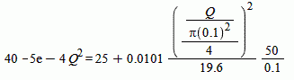 40 - 5E-4 Q^2 = 25 + [ (0,0101) * (((Q/(pi*(0,1)^2)/4)^2)/19,6) * (50/0,1) ]