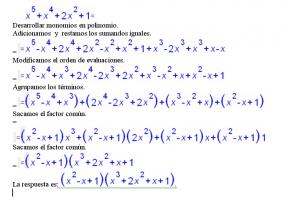 Si, es cierto, tuve una errata y era x^5 + x^4 + 2x^2 + 1 en vez de lo que puse que es. x^5 - x^4 + 2x^2 + 1 Pero lo que yo digo es que tú en el enunciado no pusiste este polinomio que dices ahora sino (x^5) + 2*(x^2) - 5*x - 6 Leelo en el comienzo de la pregunta. Yo respondí a la pregunta que me planteabas y lo hice bien. Respecto al método que se usa en eso que has hallado te diré que no hay método. No nos dice nada acerca de por qué añade esos términos y no otros en el primer paso, es simplemente un efecto de magia de quien seguramente ya conoce la respuesta y nos encamina hacia ella como si fuese la cosa más natural del mundo. Pero no lo es ni mucho menos. Me gustaría ver a ese autor factorizando un polinomio que le prepare yo. Ademas la factorización que hace nunca podrá presumir de ser irreducible puesto que todo polinomio de grado tres tiene una raíz real y ahí no aparece el factor primo monómico correspondiente a esa raíz. También hay que decir en su descargo que la expresión de esa raíz podría ser tan aparatosa que quedaría feo o que no sepa calcularla, que nadie está obligado a calcular ecuaciones de tercer grado. Pues eso es todo, yo ya no sé cuál es mi misión.