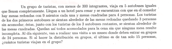 Llamemos b al número de turistas que hay en cada bus. El total serán 5b. Las ecuaciones que se extraen del enunciado son: 2b = 3 (mod 9) 3b + 3 = 0 (mod 4) 5b = 15 (mod 24) No he visto que estas ecuaciones sean las más apropiadas para el toerema chino, aunque a lo mejor os han enseñado otra definición o teoremaz complementarios que lo hagan usable. La aplicación que he hecho yo ha sido más pobre y confusa que la resolución simple del sistema de las ecuaciones de congruencias y por eso las reesuelvo. Como tampoco sé que métodos usáis, yo lo haré como si fueran ecuaciones diofánticas, que al fin al cabo es la base de toda resolución de este tipo. Por definición de congruencias, existirá un t € Z tal que: 2b = 3 + 9 t b = (3 + 9t) / 2 Vamos con este valor a la segunda ecuación: 3(3+9t)/2 = 0 (mod 4) Por lo mismo que se dijo antes existirá un s € Z tal que 3(3+9t)/2 +3 = 4s 9+27t = 2(4s -3) 9+27t = 8s - 6 27t - 8s = -15 Esa ecuación no me gusta. Si hago el cambio s = r +2 27t - 8r -16 = -15 27t - 8r = 1 Ahora si. El mcd(27,8) = 1 que divide al coeficiente derecho, luego tiene solución. Por el algoritmo extendido de Euclides econtramos una particular: 27 = 3 · 8 + 3 8 = 2 · 3 + 2 3 = 1 · 2 + 1 2 = 2 · 1 + 0 Volvemos hacia atrás 1 = 3 - 2 · 1 1 = 3 - (8 - 2 · 3) ·1 = 3 · 3 - 8 1 = 3 · (27 - 3 · 8) - 8 = 3 · 27 - 10 · 8 Comparando con la ecuación inicial tenemos t = 3 y r = 10 Y la solución general es t = 3 + 8 j para todo j € Z. La de r no me interesa. Recordemos que arriba teníamos: 2b = 3 + 9t Luego 2b = 3 + 9(3 + 8j) = 3 + 27 + 72 j = 30 + 72j b = (30+72j) / 2 = 15 + 36 j 5b = 5(15+36j) = 75 + 180j Ahora ya sustituimos este valor en la tercera ecuación de congruencias 5b = 15 (mod 24) 75 +180j = 15 (mod 24) 180j = -60 (mod 24) 180j = 12 (mod 24) Dividiendo todo por 12 15j = 1 (mod 2) Esta ecuación no necesita resolverse por el método diofántico anterior, se fe que la soluciñon es que j sea impar y ya está. Luego j=1, 3, 5 o negativos. 5b = 75 + 180j con j impar y nos decían que 5b era menor que 300, luego deberemos tomar j = 1 porque el 3 se pasa por mucho y quedará: 5b = 75 + 180 = 255 turistas Luego eran 255 turistas. --------- Y eso es todo, espero que te sirva y lo hallas entendido, si no pide aclaraciones. NO olvides puntuar.