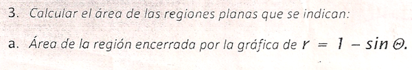 Dianis 1556! Llamemos r al radio vector y t al ángulo para poder escribir en este editor El areá de un sector de curva dada en forma polar es (1/2 de la integral del radio vector al cuadrado entre los angúlos que delimitan el sector. Se puede hacer la gráfica que es como una especie de melocotón, manzana redonda o similar. Y para cerrar la figura es preciso usar el angulo desde 0 hasta 2PI. Luego: Area = (1/2) $(1-sent)^2 dt entre 0 y 2PI $(1-sent)^2 dt = $(1 + sen^2(t) - 2sent) dt = t + 2cost + $sen^2(t)dt se usa una fórmula trigonometrica $sen^2(t) dt = (1/2) $ 1 - cos(2t) dt = (1/2)(t - sen(2t)/2) juntándolo todo $(1-sent)^2 dt = t + 2cost + (1/2)(t - sen(2t)/2) = 3t/2 + 2cost - 1/4 sen(2t) Y ahora lo calculamos entre los límites de integración. Los términos con sen y cos se van a anular pues valen lo mismo en 0 que en 2PI o 4PI. Luego Area = (1/2)[3·2PI/2 - 0] = (3/2)PI = 4,712389 Y eso es todo.