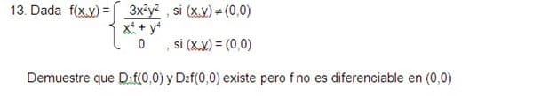 $$\begin{align}&\lim_{(x,y)\to(0,0)}\frac{f(x,y)-(f(0,0)+0(x-0)+0(y-0))}{\sqrt{(x-0)^2+(y-0)^2}}=0\\ &\\ &\lim_{(x,y)\to(0,0)}\frac{\frac{3x^2y^2}{x^4+y^4}-0}{\sqrt{x^2+y^2}}=\lim_{(x,y)\to(0,0)}\frac{3x^2y^2}{(x^4+y^4)\sqrt{x^2+y^2}}\\ &\\ &\\ &\text{hallemos el límite por el camino x=y}\\ &\\ &\lim_{x\to 0}\frac{3x^4}{2x^4 \sqrt{2x^2}}=\frac 3{2 \sqrt 2}\lim_{x\to 0}\frac{1}{x}= \infty\\ &\\ &\end{align}$$Luego el límite no es 0 ya que ni siquiera existe y por lo tanto la función nbo es diferenciable en (0,0)