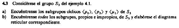 Respecto al diagrama reticular es imposible dibujar aquí, pero es muy sencillo, arriba tendrías S3 del que salen flechas a los 4 subgrupos propios que te he dicho que están en el medio y abajo el grupo del elemento neutro que recibe flechas de los cuatro del medio.