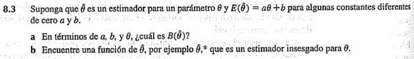 $$\begin{align}&B(\widehat{\theta})=E(\widehat{\theta})-\theta=\\ &E(a\theta+b)-\theta=\\ &aE(\theta)+b-\theta =\\ &a\theta+b-\theta=\\ &(a-1)\theta+b\end{align}$$b) El estimador será insesgado si el sesgo es cero