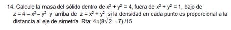 cordial saludo valeroasm. En el siguiente ejercicio me piden hallar la masa del solido delimitado por las superficies cilíndricas que allí mencionan.empezando porque no se hacer el dibujo y ya te podrás imaginar el resto. Necesito que me ayudes a resolverlo, como es eso que la densidad en cada punto es proporcional a la distancia al eje de simetría y como se cual es el eje de simetría.aquí te lo dejo