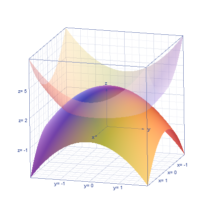 Lamentablemente en dos años y pico que llevo respondiendo preguntas, no he dado con un program que sepa manejar y me haga gráficas de funciones en 3D de manera aceptable. Así que habrá que echarle imaginación. Bueno, el programa me deja dibujar 2 funciones, pero no 4 como haría falta.