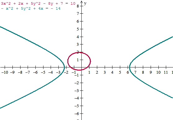 $$\begin{align}&x =\frac{4\pm \sqrt{16+20y^2+56}}{2}=\\ &\\ &2\pm \sqrt{18+5y^2}\\ &\\ &\text{El valor minimo del radicando es}\\ &\\ &\sqrt{18}=4.24264006687\\ &\\ &\text{con ello}\\ &\\ &x < 2-4.24264006687 \\ &x < -2.242640687\\ &\\ &\\ &x> 2 +4.24264006687\\ &x> 6.242640687\end{align}$$Con lo cual se ve como el dominio de la elipse está metido dentro de la la zona donde no tiene dominio la hipérbola y por lo tanto es imposible que haya puntos comunes.
