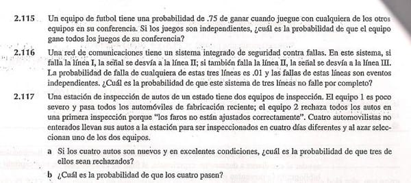 2.115 Aquí el autor se queda tan pancho sin decirnos cuántos equipos hay en cada conferencia, como si todos tuviéramos que saberlo. Bueno, en la respuesta pone 0,75^4, luego se supone que juega cuatro partidos y la conferencia tiene 5 equipos. Pues esa es la soluciónj, lo que él dice. ---------------- 2.116 La probabilidad de fallar las tres líneas es 0,01^3 = 0,001 Luego la probabilidad de no haber fallo completo es 1 - 0,001 = 0,999 ----------------- 2.117 Si son autos nuevos van a pasar la inspección si el equipo es el 1 y no la van a pasar si les toca el equipo 2. Las elecciones posibles de equipo son 2^4 = 16 a) Si son rechazados tres exactamente era porque tres autos fueron inspeccionados por el equipo 2. Y las combinaciones posibles para este usceso son C(4,3) = 4 P(3rechazados) = 4/ 16 = 1/4 = 0,25 b) La unica combinacion que salva alos cuatroes que todos los inspectores sean del equipo 2 P(los 4 la pasen) = 1 / 16 = 0,0625 Y eso eas todo.