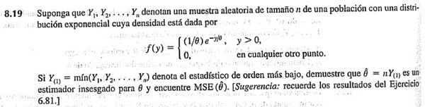 $$F(y) =\int_0^y \frac{e^{-x/\theta}}{\theta}dx=\left[-e^{-x/\theta}\right]_0^y=1-e^{\;y/\theta}\\ \\ \\ g(x)=n[1-(1- e^{-y/\theta})]^{n-1}·\frac{e^{-y/\theta}}{\theta}=\\ \\ \frac{ne^{(n-1)y/\theta}·e^{-y/\theta}}{\theta}=\frac{ne^{-ny/\theta}}{\theta}\\ \\ E(\widehat{\theta})=E(nY_{(1)}) = \frac{n^2}{\theta}\int_0^{+\infty}ye^{-ny/\theta}dy=\\ \\ u=y \implies du = dy\\ dv=e^{-ny/ \theta}dy\implies v =-\frac{\theta e^{-ny/\theta}}{n}\\ \\ =\frac{n^2}{\theta}\left(\left[ -\frac{y \theta e^{-ny/\theta}}{n} \right]_0^{+\infty}+\int_0^{+\infty} \frac{\theta e^{-ny/\theta}}{n}dy \right)=\\ \\ \frac{n^2}{\theta}\left( 0-\left[ \frac{\theta^2e^{-ny/\theta}}{n^2} \right]_0^{+\infty}\right)=\frac{n^2}{\theta}·\frac{\theta^2}{n^2}=\theta\\ \\ \text{Luego sí, }\widehat{\theta}\text{ es un estimador insesgado de }\theta$$ Yo pensaba que la sugerencia era para calcular el MSE y no la había mirado. Si lo hubiera hecho esta parte primera era directa ya que el 6.81 decía que la media del mínimo de distribuciones exponenciales independientes e igualmente distribuidas con media beta para cada una de ellas, es beta/n. En este caso la media es theta, luego la media de la mínima es theta/n, luego la media de del estimador n por mínima es n(theta/n) = theta.