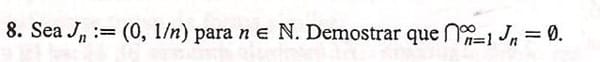 En el ejercicio anterior demostrábamos que la intersección infinita de los intervalos cerrados es el conjunto {0}. Con los mismos razonamientos anteriores llagaremos a que la intersección los n primeros intervalos es (0, 1/n). Y de igual forma que antes cualquier elemento negativo no puede pertenecer a la intersección infinita y cualquier positivo tampoco. Luego solo podría pertenecer el cero, pero el cero tampoco pertenece por ser abierto el intervalo por la izquierda.