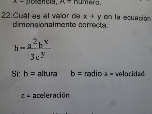 Matemáticas emariana830 el 11 abr. 13 Análisis dimensional(física) Seguir Siguiendo Dejar de seguir 1 respuesta Respuesta de Valero Angel Serrano Mercadal 1 1 Valero Angel Serrano Mercadal, Me voy x tiempo. Necesito hacer otras cosas, descansar y que... Hallar el valor de x+y en al ecuación dimensional$$\begin{align}&h=\frac{a^2b^x}{3c^y}\\ &\\ &h=altura=L\\ &b=radio=L\\ &a=velocidad=LT^{-1}\\ &c=aceleración=LT^{-2}\\ &\\ &\\ &\\ &L=\frac{(LT^{-1})^2L^x}{3(LT^{-2})^y}=\frac{L^2T^{-2}L^x}{3L^yT^{-2y}}\\ &\\ &3L^{y+1}T^{-2y}= L^{2+x}T^{-2}\\ &\\ &y+1=2+x\\ &-2y=-2\\ &y=1\\ &1+1=2+x\\ &x=0\\ &\\ &Luego\\ &x+y=0\end{align}$$ Y eso es todo. el 12 abr. 13 - Anónimo ahora mismo Añadir comentario Usa los comentarios si quieres aportar algo a esta respuesta. No los utilices para preguntar algo nuevo. Cancelar Enviar