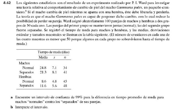 $$\begin{align}&IC =\overline{y_1}-\overline{y_2}\pm z_{\alpha/2}·\sigma{(\overline{y_1}-\overline{y_2})}\\ &\\ &\sigma_{(\overline{y_1}-\overline{y_2})}=\sqrt{\frac{\sigma_1^2}{n_1}+\frac{\sigma_2^2}{n_2}}\approx \sqrt{\frac{s_1^2}{n_1}+\frac{s_2^2}{n_2}}=\\ &\\ &\sqrt{\frac{7.1^2}{34}+\frac{8.1^2}{41}}= 1.755816323\\ &\\ &\\ &IC =24.8-21.3 \pm 2.5758·1.755816323\\ &\\ &3.5 \pm 4.5226\\ &\\ &IC = [-1.0226, 8.0226]\end{align}$$b) Está claro que el tiempo promedio de muda es superior para los machos normales que los separados, pero no es seguro al 99% porque el extremo inferior del intervalo de confianza es negativo, corresponde a la situación contraria.