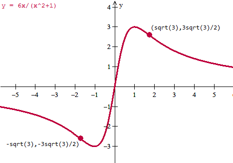 $$\begin{align}&f(x) = \frac{6x}{x^2+1}\\ &\\ &\\ &f'(x) = \frac{6(x^2+1)-6x(2x)}{(x^2+1)^2}=\\ &\\ &\\ &\frac{6x^2+6-12x^2}{(x^2+1)^2}= \frac{ 6(1-x^2)}{(x^2+1)^2}\end{align}$$Los ceros de la derivada primera son